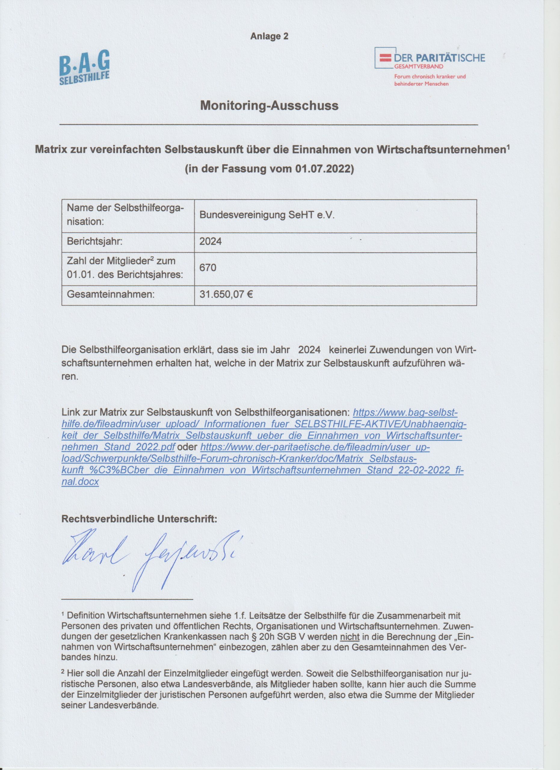 Der Verband erklärt, dass er im Jahr 2024 keinerlei Zuwendungen von Wirtschaftsunternehmen erhalten hat, welche in der nachfolgenden Matrix für eine Selbstauskunft aufzuführen wären.